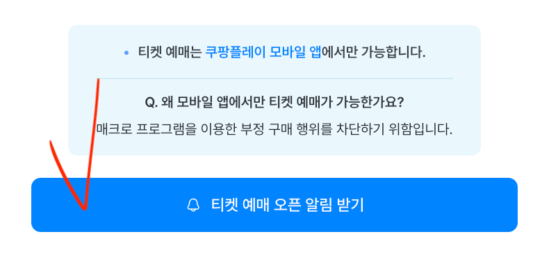 예매 페이지로 이동하면, 하단 이미지와 같이 '티켓 예매 오픈 알림 받기' 버튼을 선택하시면 됩니다.