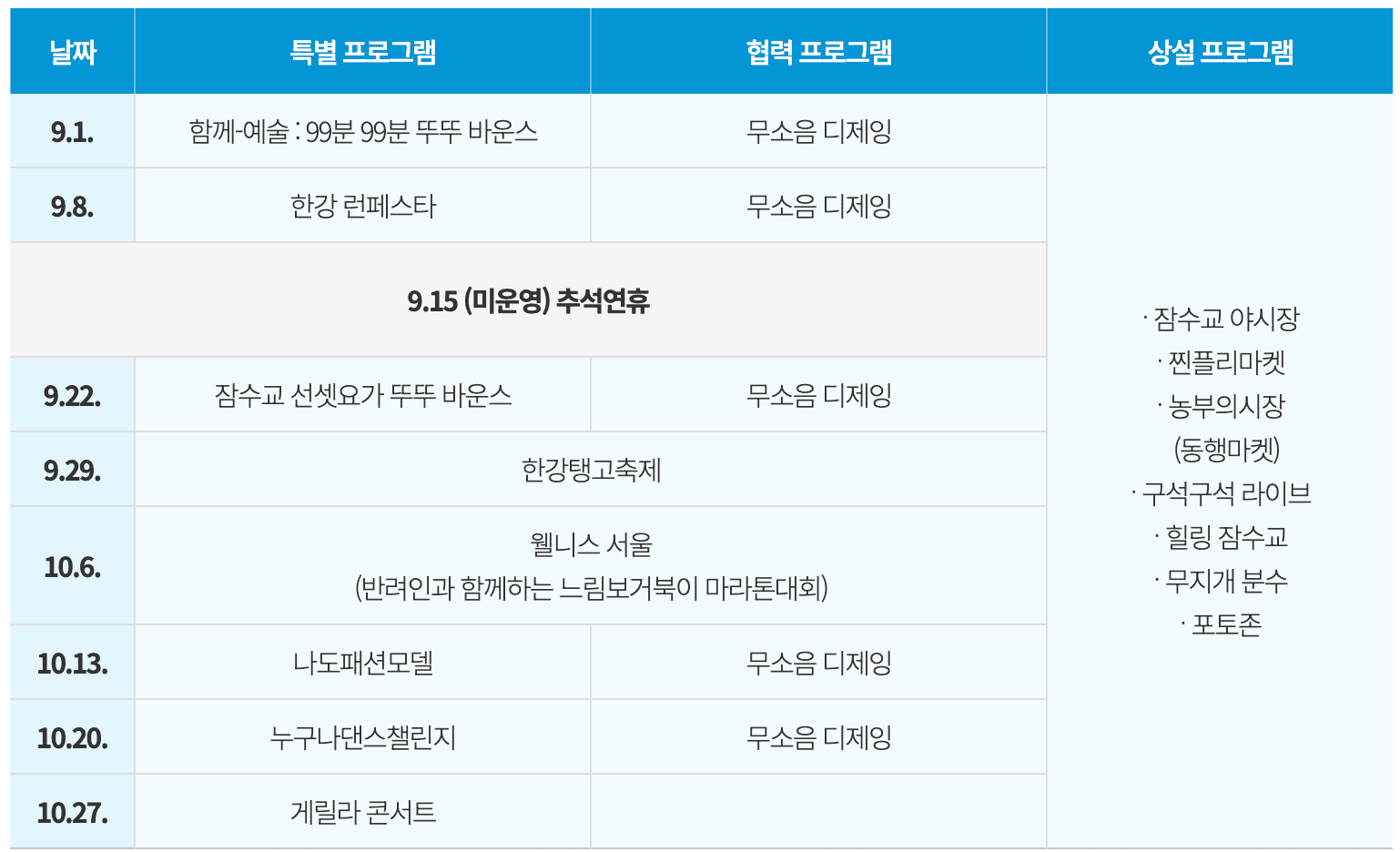 지난 5월 인기에 힘입어 9월(가을) 또 다시 시작하는 한강-잠수교 뚜벅뚜벅 축제에 대한 모든 정보를 담아 정리했습니다.