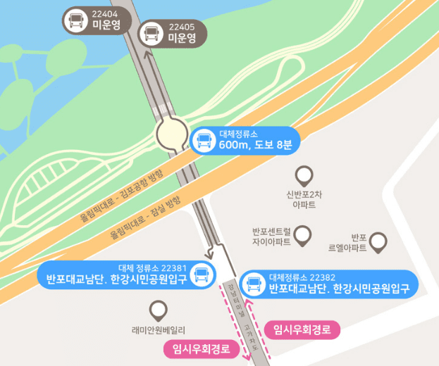 잠수교 축제로 인해 9.1~10.27 매주 일요일마다 11:00-23:00 동안 교통통제가 진행되는데요.